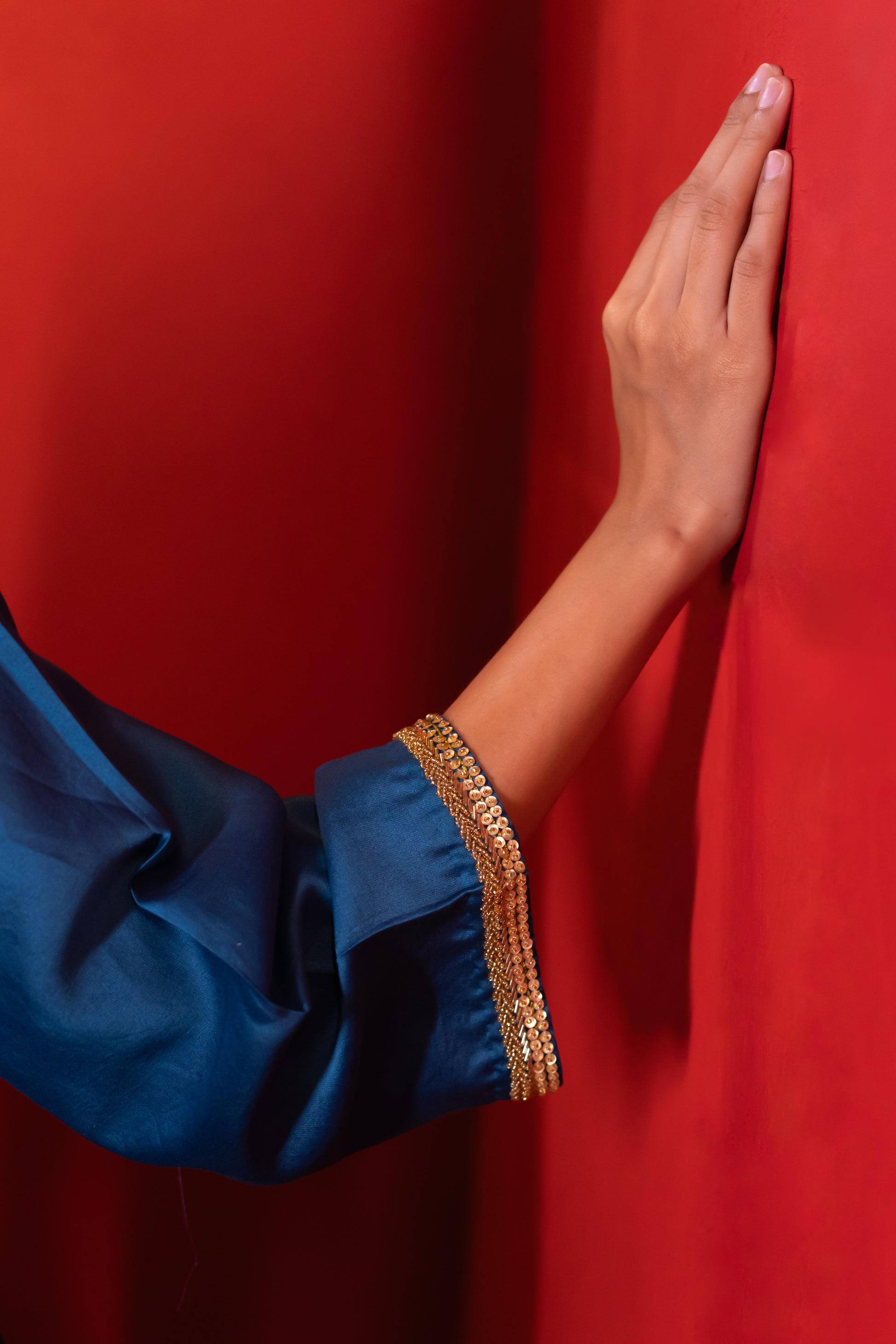 DESCRIPTION : A Blue Mukaish Kali Kurta adorned with Sequin and Dabka work on the Kalis, neckline, and sleeves, paired with Pants featuring an Organza embroidered panel, and a blue and apple green colour-blocked Organza Dupatta.
