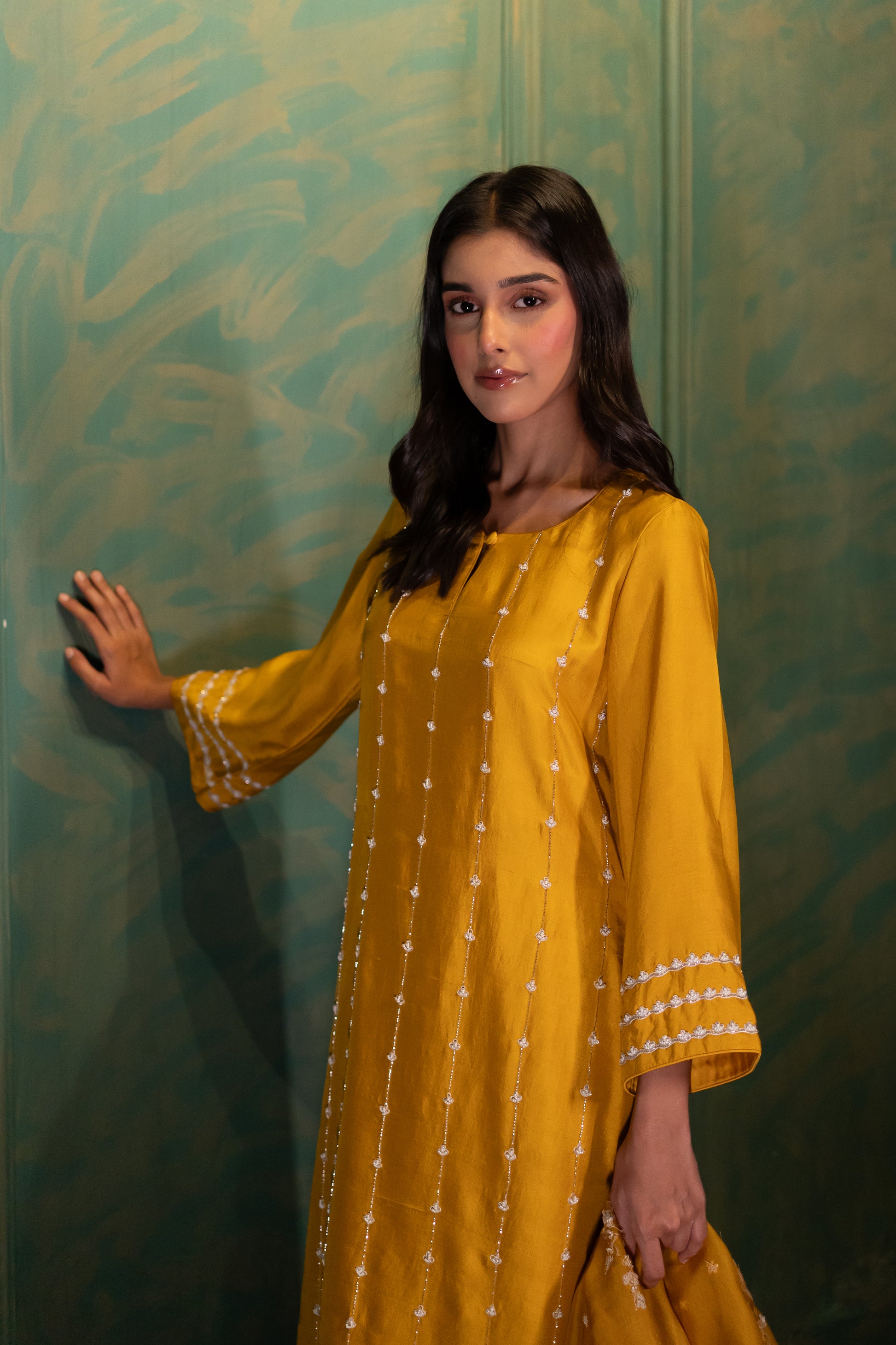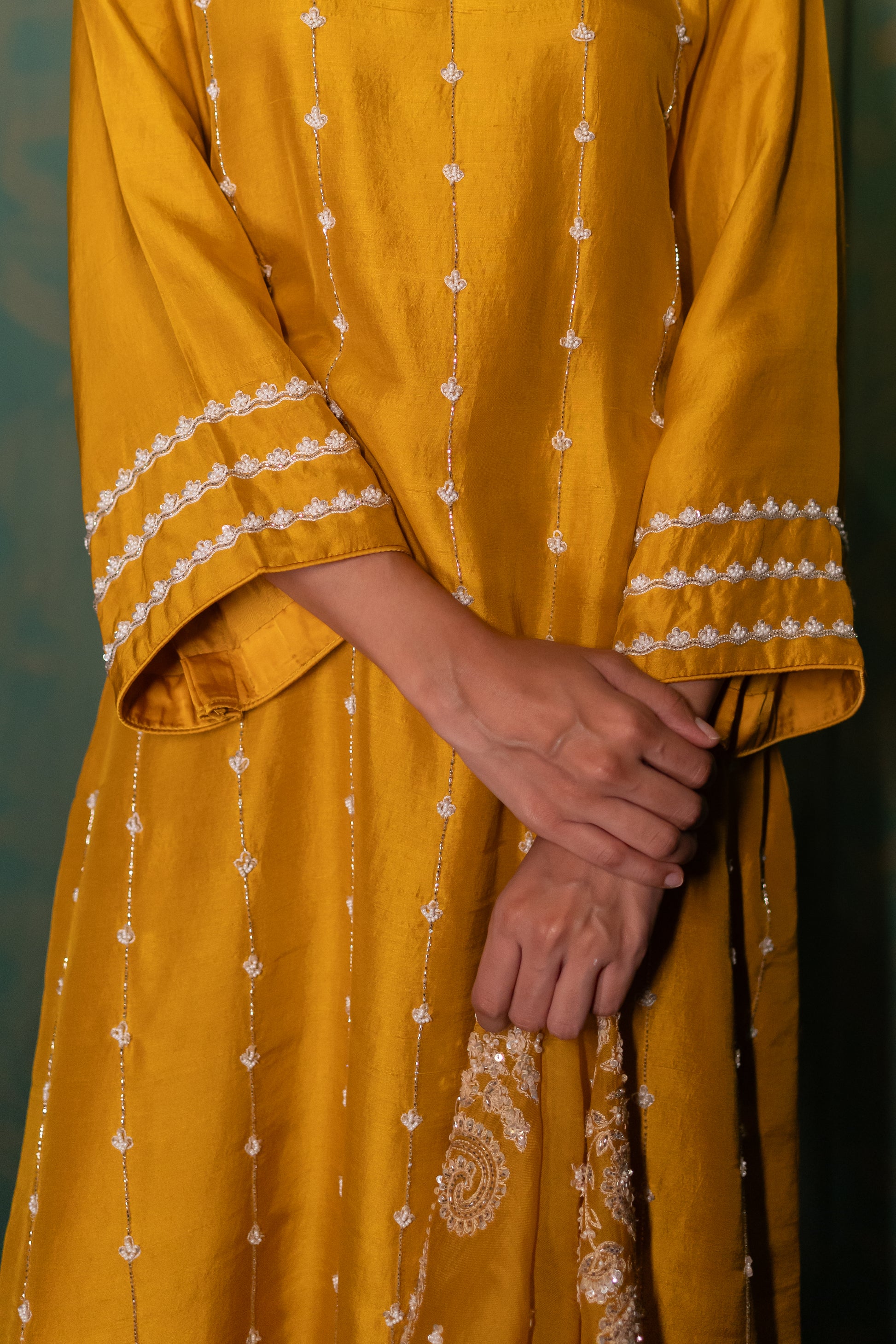 DESCRIPTION : A Mustard Dupion Silk Embroidered Kurta adorned with Sequin, Pearl, and Cutdana linework, paired with a Farshi Salwar featuring delicate Bootis, and an Organza Dupatta enhanced with an intricately embroidered floral border.