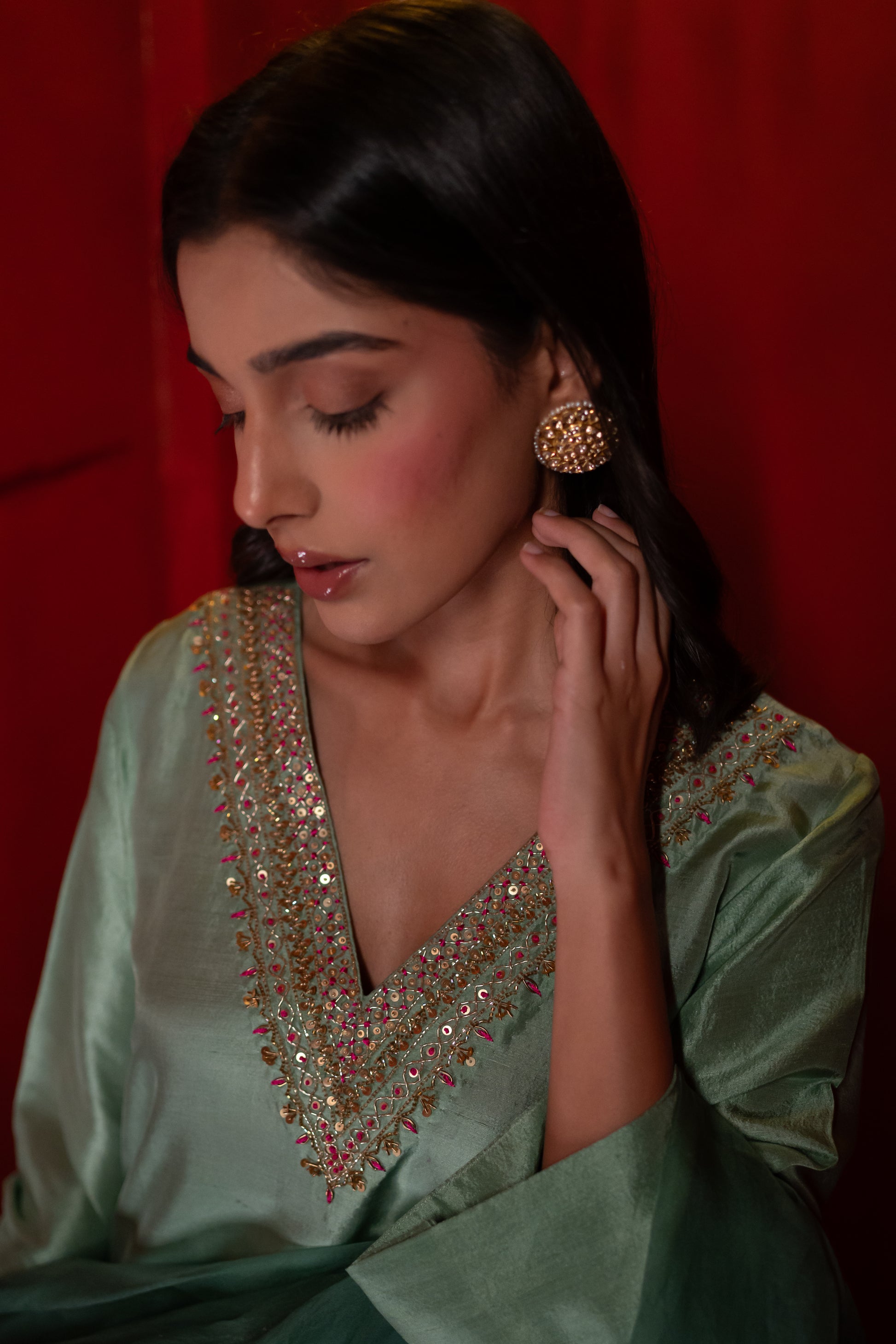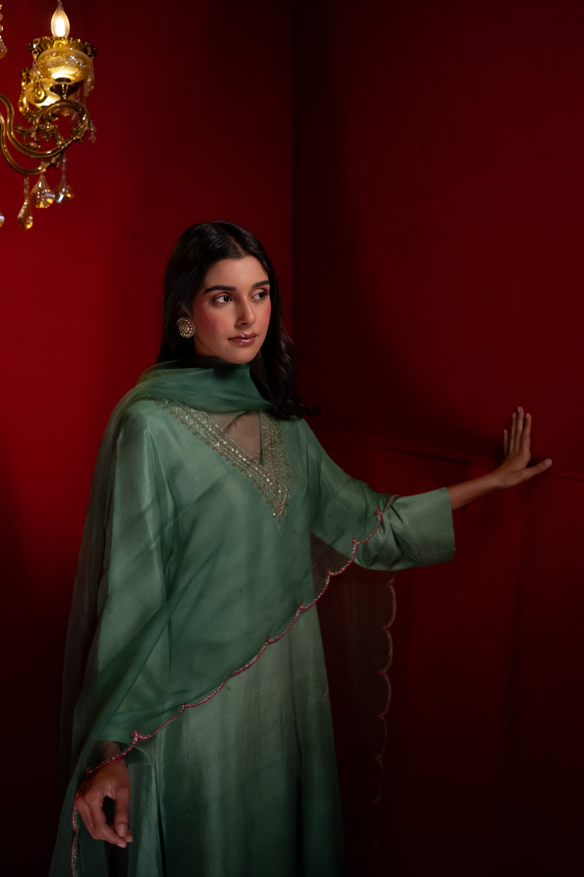 DESCRIPTION : An Ombre Sage Green Asymmetrical Kurta adorned with a Sequin, Dabka, and Fuchsia thread embroidered neckline, paired with Pants featuring an embroidered Organza panel, and a delicate scalloped Organza Dupatta that completes the ensemble with effortless grace.