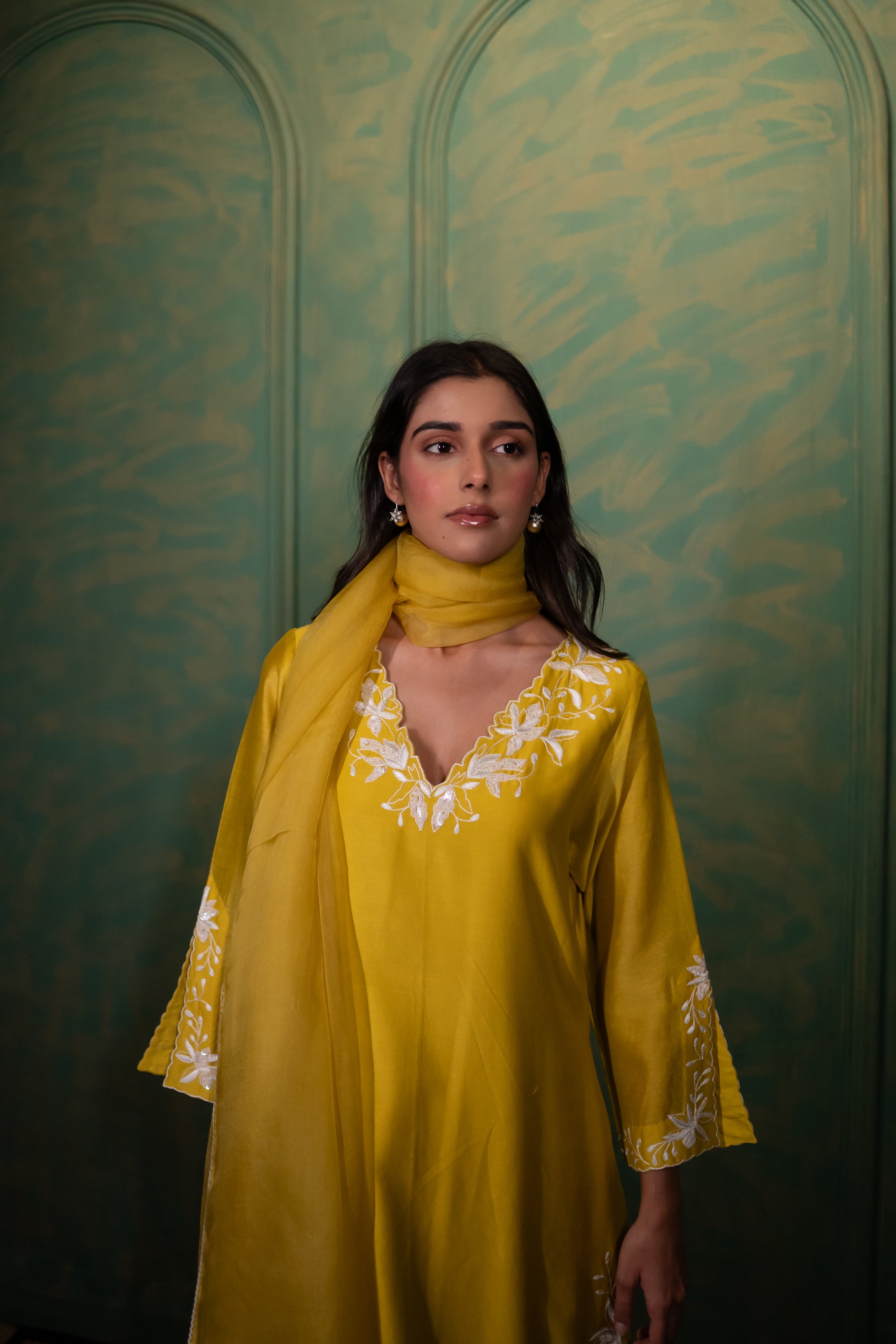 DESCRIPTION : A Yellow Chanderi A-Line Kurta featuring Thread work around the neckline, slits, and sleeves with intricate Cut Detailing, paired with Block-Printed Pants and an Organza Dupatta finished with Crochet Lace on all sides.